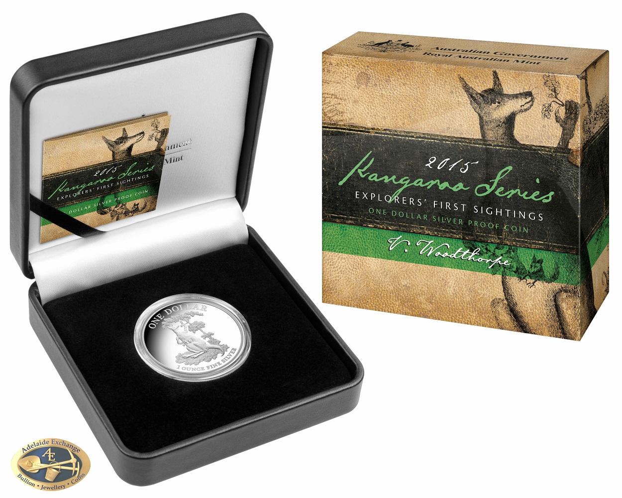 2015 $1 Kangaroo Series Fine Silver Proof Coin, Explorers First Sightings. Kangaroos were a curiosity to early Australian settlers. Kangaroos were depicted in words and artworks which seem inaccurate today, but are filled with the beauty of these animals capturing people's imaginations. Certificate of authenticity is included with this coin, with this coin numbered 339. Mintage 10,000.