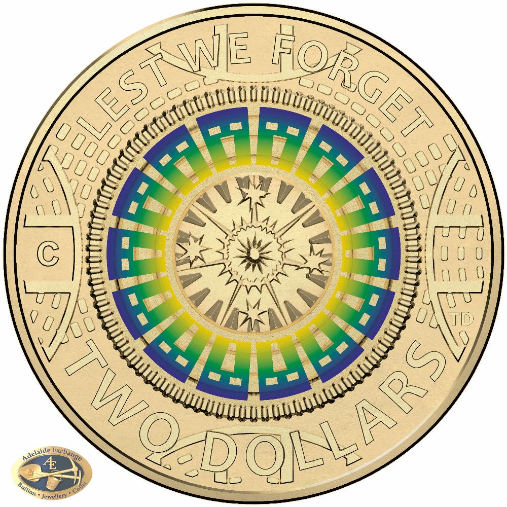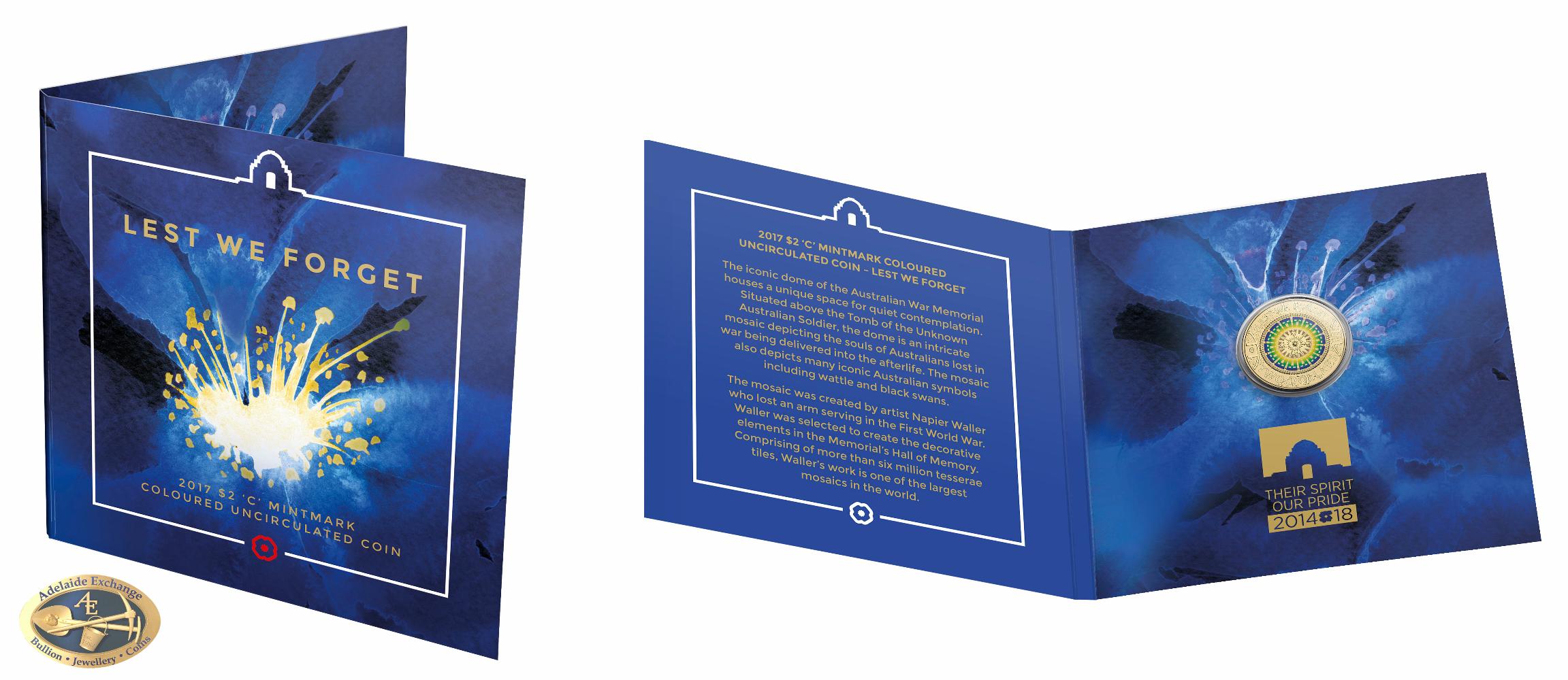 2017 $2 'C' Mintmark Coloured Uncirculated Coin-Lest We Forget. The iconic dome of the Australian War Memorial houses a unique space for quiet contemplation. Situated above the Tome of the Unknown Australian Soldier, the dome is an intricate mosaic depicting into the afterlife. The mosaic also depicts many iconic Australian symbols including wattle and black swans. The mosaic was created by artist Napier Waller who lost an arm serving in the First World War. Waller was selected to create the decorative elements in the Memorial's Hall of Memory. Comprising of more than six million tesserae tiles, Waller's work is one of the largest in the world. Mintage 40,000.